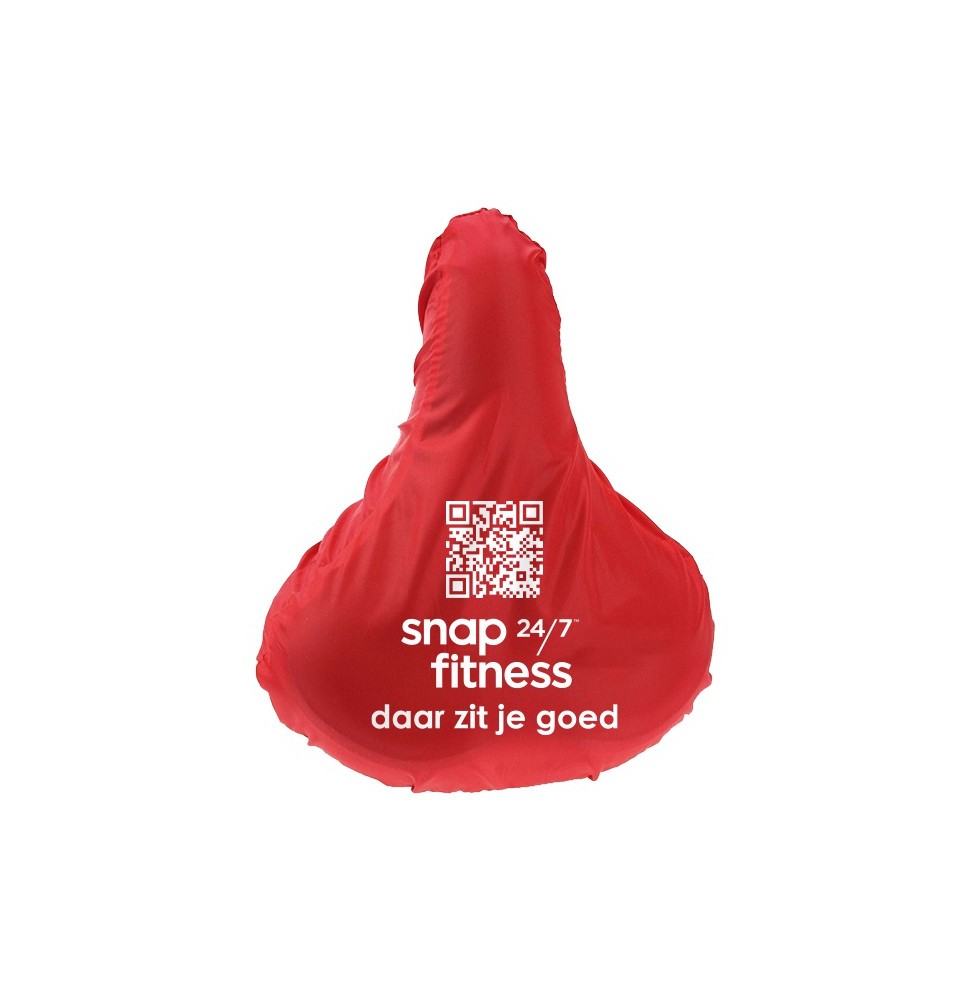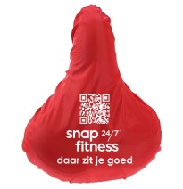 Rode zadelhoesje met QR code die naar de Snap Fitness site leidt. Met dit zadelhoesjes om je zadel is het een feest om op de fiets te stappen. Houd je broek droog en schoon.